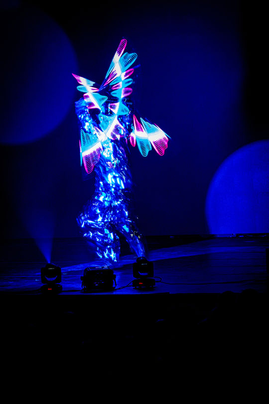 In der Duo-Show Prismatic verschmelzen zwei Mirror Dancer zu einer atemberaubenden Einheit aus Bewegung und Licht. Ihre Spiegeloutfits fangen jeden Strahl ein und lassen eine kaleidoskopartige Welt aus Reflexionen und Farben entstehen, die den Raum in funkelndes Leben taucht. Mit einer perfekten Mischung aus synchronem Tanz, überraschenden Formationen und kreativen Lichteffekten ziehen sie das Publikum in ihren Bann. Den glanzvollen Höhepunkt bilden die LED-Pois, auf die personalisierte Sujets programmiert werden können und so ein einzigartiges, magisches Finale erschaffen.